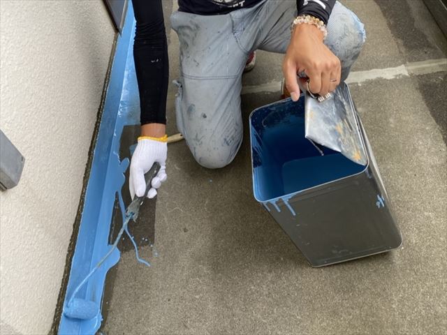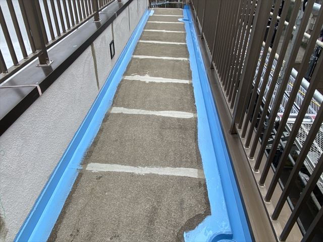 ビル共用部の床・階段の床のウレタン塗膜防水工事の様子です。