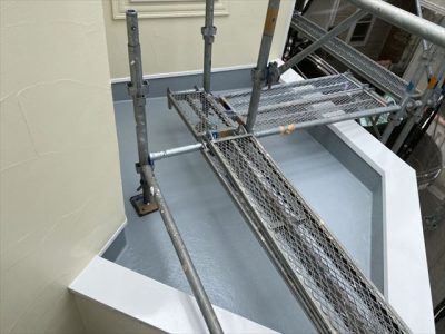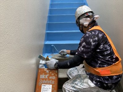 ビル共用部の床・階段の床のウレタン塗膜防水工事の様子です。